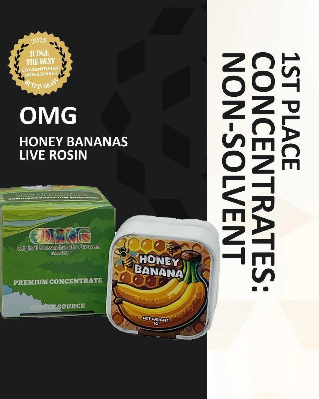 Honey Banana (strawberry banana x honey boo boo) is an award winning strain that offers consumers and patients a full body punch. Users report heavy sedative effects with an all over body relaxation setting in quickly. Intense notes of ripe banana with a hint of gas and bread can be detected in both smell and taste. This cut was sourced by Good Will Hunting and grown and washed in house by the team here at Wellman/OMG as our first Headline in house live rosin offering.
